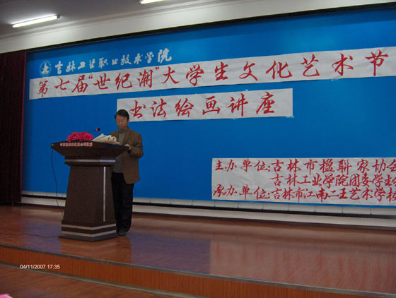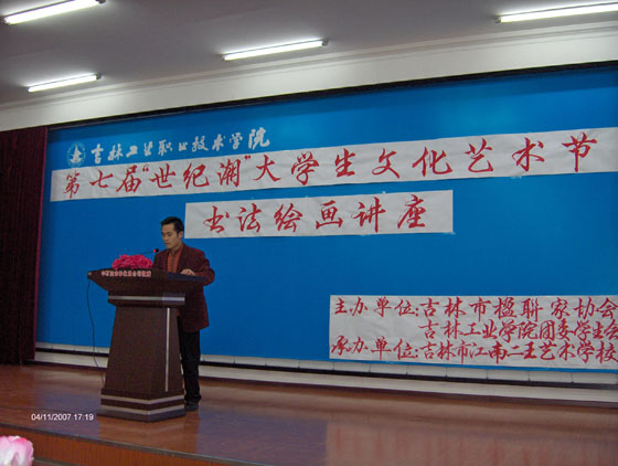 由吉林市楹联艺术家协会和吉林工业职业技术学院联合主办,吉林江南二王艺术学校承办的免费书法绘画讲座于11月4日举行。首先,市楹联协会副主席刘凤麟致辞,简述书法进高校的意义。接着青年书法家许义、王刚、王强三位老师先后讲述如何欣赏篆书、行书及国学与书法的关系。随后,刘凤麟、许义、王刚、王强、刘东挥毫泼墨展示书法魅力,一位77岁老人和年轻女士展示刀画艺术。生动的演讲,广博的知识,精彩的演示,吸引260多人的目光。这是主办单位首次开展此项活动,今后还将在其它高校展开。