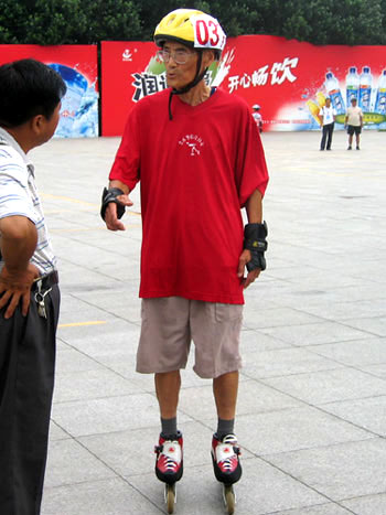 77岁的年龄已经超过元老组的年龄上限,所以徐大爷只能以吉林市轮滑协会代表队领队的身份来参加比赛。徐大爷说,他从18岁就开始滑冰,几乎没有间断,对滑冰无限热爱,也因此获得了健康的身体。近两年轮滑运动的发展,徐大爷也受到吸引,加入了进来。谁知道一发不可收拾,轮滑已经成为徐大爷每天必须的活动项目。每天他都到广场上滑上一会儿,还当上了教练,给孩子们传授经验。徐大爷自己也非常热衷于开发新动作,一个前后脚跟单轮滑行的动作就自己琢磨了半个月,最后无师自通。